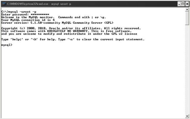 Команда mysql –uroot –p запускает клиентскую программу для работы с сервером БД. Клиентская программа устанавливает сетевое соединение с сервером БД и позволяет вводить инструкции SQL в интерактивном режиме для получения необходимой информации из БД.