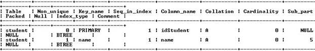 Из описание видно, что в таблице уже имеется индекс типа PRIMARY, созданный автоматически при создании таблицы. Предположим, что необходим частый поиск по имени студента, для чего следует создать индекс: