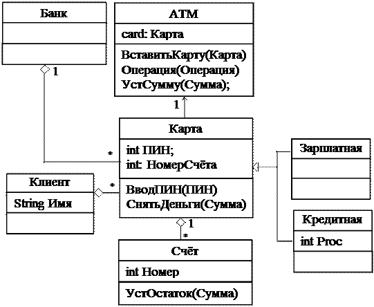 Формализованное представление информации в виде диаграмм классов, получаемое на основе анализа бизнес-процесса, показывает структурные отношения между понятиями заданной для разработки ПП предметной области. Пример диаграммы классов для предметной области банковской системы (объект моделирования - «Банкомат») приведен на рисунке 2. На диаграмме классов предметной области не показывают специальные классы программной системы, обеспечивающие её работу (связь с БД, шаблоны и т.д.).