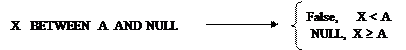 2) Якщо вираз, що визначає нижню границю діапазону має значення NULL, то перевірка BETWEEN ... AND… дає результат FALSE у випадку, коли вираз, що перевіряється, має значення, більше ніж значення верхньої границі діапазону; і дає результат NULL в іншому випадку:
