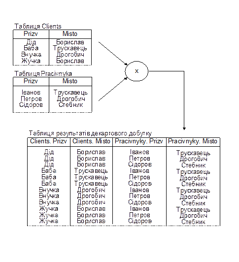 Декартовий добуток двох таблиць – це таблиця, яка складається із всіх можливих пар рядків обидвох таблиць.