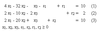 Целью решения вспомогательной задачи является получение допустимого базисного решения не содержащего искусственных переменных (r1,r2). Для этого сформируем вспомогательную целевую функцию :