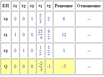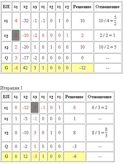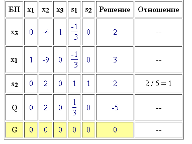 Получено оптимальное решение вспомогательной задачи (найден минимум функции G т.к. в строке целевой функции нет отрицательных коэффициентов). Все искусственные переменные вышли из базиса и поэтому мы можем приступить к решению исходной задачи, приняв полученное базисное решение в качестве опорного. Сторка "G" нам больше не нужна, принятие решения о направляющем столбце, во всех последующих итерациях, будем принимать по строке "Q"