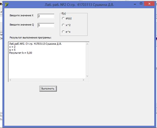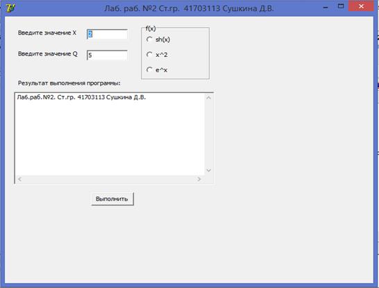 Разработать приложение, реализующее разветвляющийся вычислительный процесс в соответствии с индивидуальным заданием. В качестве f(x) использовать по выбору: sh(x), х2; е.