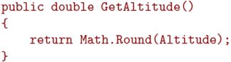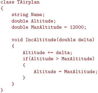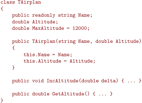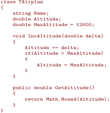 Возвращаясь к примеру, разумно дать возможность вызывать метод IncAltitude() для изменения высоты. Для этого нужно назначить для метода IncAltitude спецификатор доступа - public. Но не стоит давать возможность пользователям класса самостоятельно изменять высоту путем доступа к полю Altitude, поскольку тогда возможно превышение порога высоты. В тоже время, если у поля Altitude будет спецификатор доступа private, то пользователь не сможет не только изменить это поле, но и прочитать. Для этого нужно создать еще один метод, который будет выдавать пользователю значение высоты: