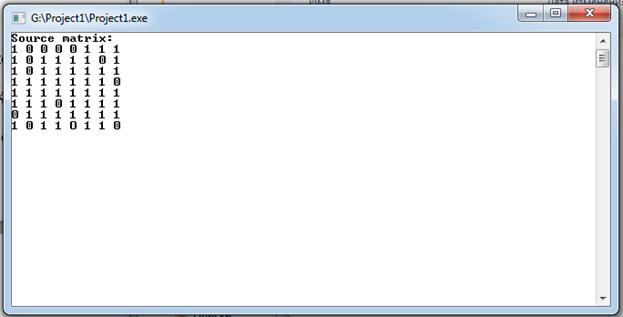 Использование квадродерева продемонстрировано на классической задаче разбора бинарной матрицы N на M. Для примера в программе используется матрица 8 на 8, которая заполняется случайным образом. Сначала выводится матрица, потом выводятся данные по ходу формирования дерева, затем выводится само дерево.