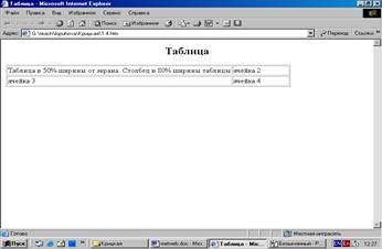 <TR><TD WIDTH=80%>Таблица в 50% ширины от экрана. Столбец в 80% ширины таблицы</TD><TD>ячейка 2</TD>