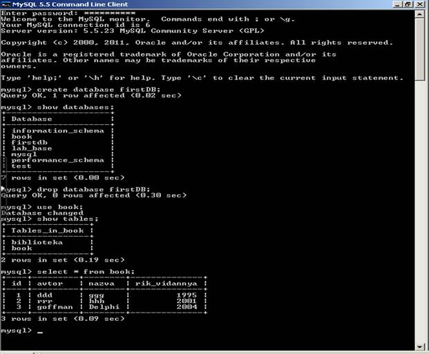 Для створення нової бази даних використовують команду create database [if not exist] <ім’я бази даних>, а для видалення – drop database <db_name>(Рисунок 6). Команду use <db_name> використовують для переходу до потрібної бази даних та її відкриття.