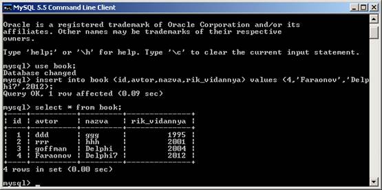 Рисунок 8. Внесення нового запису в базу даних book