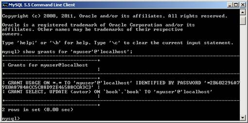 За допомогою оператора show grants можна відобразити на екрані привілеї, які призначені користувачеві myuser (Рисунок 11).