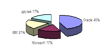 Основными производителями таких систем обработки и хранения данных являются 3 корпорации: Oracle, Microsoft и IBM. Диаграмма соотношения объемов продаж соответствующих систем (источник: IDC Report, Май 2006) приводится на рис.4.
