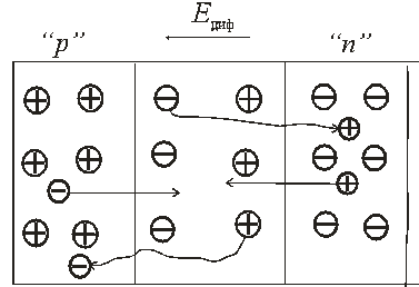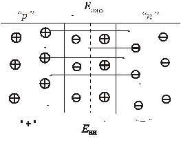 После контакта полупроводников p- и n- типа происходит диффузионное движение носителей вследствие разности их концентрации: дырок из области p в n- область и электронов n- области в полупроводник с электропроводностью р- типа. После ухода основных носителей из приконтактной области возникает нескомпенсированный заряд ионов примесей, неподвижно расположенных в узлах кристаллической решётки: в р- области – отрицательный, в п- области – положительный. В приконтактном слое возникает при этом электрическое поле Едиф, препятствующее дальнейшему перемещению основных носителей и создающее движение неосновных носителей заряда. При некоторой величине поля Едиф. устанавливается состояние равновесия, характеризующееся энергетической диаграммой рис. 1.5, б. Величина энергии в области объёмного заряда