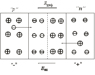 Внешнее напряжение в зависимости от его полярности может быть направленно либо навстречу диффузионному полю, либо в ту же сторону.