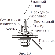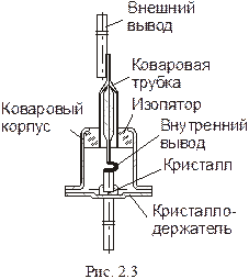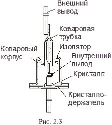 Основой конструкции является коваровый корпус, приваренный к кристаллодержателю. Корпус изолирован от внешнего вывода стеклянным проходным изолятором. Внутренний вывод имеет специальный изгиб для того, чтобы уменьшить механические напряжения при изменении температуры. Внешняя поверхность стеклянного изолятора покрывается светонепроницаемым лаком для предотвращения попадания света внутрь прибора, что может вызвать генерацию пар электрон-дырка и увеличить обратный ток p-n-перехода.