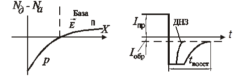 Как уже указывалось, при работе диода в импульсном режиме существенное значение при использовании его в быстродействующих схемах имеет время восстановления обратного сопротивления. Значительно улучшить этот параметр можно, если изготовить переход методом диффузии примесей. В этом случае распределение концентрации примесей полупроводников будет неравномерным (рис. 2.13, а). Такое распределение концентрации вызовет встречное диффузионное и дрейфовое движение потоков носителей, в результате чего установится состояние равновесия с определенной напряжённостью электрического поля: