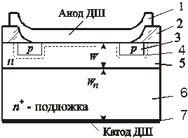 На этом рисунке цифрой 1 показан металл анода, 2 – слой оксида, 3 – охранное кольцо, 4 – ОПЗ, 5– активный слой базы, 6 – сильно легированная подложка, 7 – металл катода.
