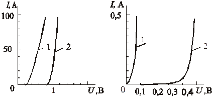 Диод Шотки изготовляют групповым способом на пластинах больших диаметров. Для обеспечения механической прочности пластины (во избежание поломки) толщина пластины должна быть более 150…200 мкм. Однако для ДШ с рабочим напряжением до 50 В толщина активной области кристалла не должна превышать 10 мкм. Выходом является конструкция на рис. 2.15, активный слой которой w = 2…10 мкм, а сильнолегированная подложка с концентрацией доноров nd= 5*1018 … 5*1019 см-3 имеет значительную толщину wп – около 200 мкм. Наличие такой подложки значительно снижает сопротивление rб и облегчает создание омического контакта с металлом катода. На рис. 2.16, а показаны прямые характеристики ДШ (1) и для сравнения приведена ВАХ диода с p-n- переходом (2) в области больших токов, а на рис. 2.16, б – для малых токов соответственно.