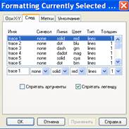 С помощью вкладки След легко установить комбинацию параметров линии и точек для каждого из рядов данных, представленных на графике. Для этого требуется выделить в списке нужный ряд данных (его положение в списке соответствует положению метки зависимости у оси Y) и изменить в списках в середине диалогового окна следующие параметры: