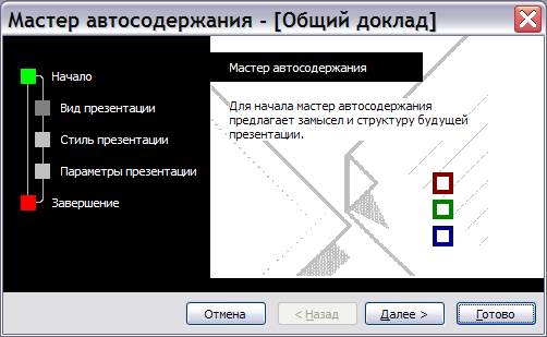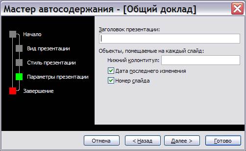 Последовательно заполняются появляющиеся диалоговые окна. В последнем окне Мастера автосодержания нажимается кнопкаГотово и программой создается презентация.