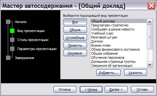 После нажатия кнопкиОК появляется окно Мастера авто-содержания для выбора вида презентации.