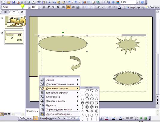 Любая созданная фигура, которую можно добавить в слайд, становится объектом. Объект имеет контур и внутреннюю область, цвета которых по умолчанию задаются текущей цветовой схемой. Каждый элемент объекта может быть отформатирован в соответствии с общим проектом презентации.