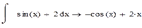 Для этого ниже задачи 3, используя панель Calculus (Матанализ), введите знак неопределенного интеграла ∫ и функцию sin(x)+2 dx. Для вычисления значений в аналитическом виде, используя панель Evaluation (Вычисление), введите знак → (Evaluate Simbolically) после dx и щелкните левой клавишей по нему. В результате на рабочем листе должно быть решение: