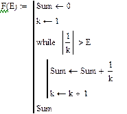 На Рисунке 1 показана чуть более объемная программа, включающая цикл типа while. Обнаружив заголовок цикла типа while, Mathcad проверяет условие цикла. Если оно истинно, то Mathcad выполняет тело цикла и снова проверяет условие. Если оно ложно, то Mathcad заканчивает выполнение цикла.