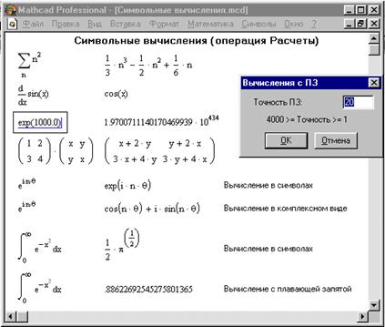 Эта операция содержит подменю. КомандаСимволические тут наиболее важная. Назначение других команд очевидно: они нужны, если результат требуется получить в форме комплексного или действительного числа. К примеру, если вы хотите вместо числа p получить 3.141..., используйте командуС плавающей запятой….В режиме символьных вычислений результат может превосходить машинную бесконечность системы — см. пример на вычисление ехр(1000.0) на Рисунке 10. При этом число точных значащих цифр результата практически не ограничено (или, точнее говоря, зависит от емкости ОЗУ).
