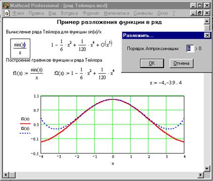 ОперацияРазложить на составляющие... возвращает разложение в ряд Тейлора выражения относительно выделенной переменной с заданным по запросу числом членов ряда n (число определяется по степеням ряда). По умолчанию задано п = 6. В разложении указывается остаточная погрешность разложения. На Рисунке 11 представлено применение этой операции для разложения функции . Минимальная погрешность получается при малых х (см. графическое представление функции и ее ряда).
