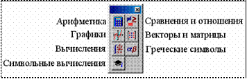 Панель вывода палитр математических знаков (рис. 2) позволяет включать палитры, с помощью которых можно вводить в документы практически все известные математические символы, операторы и объекты, управлять вычислениями в системе, осуществлять построение графиков.