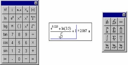 Например, для ввода и вычисления значения выражения в MathCAD потребуется палитра математических знаков "Арифметика" (рис. 3, а). При этом вычисляемое выражение будет введено в месте размещения маркера ввода, как показано на рис. 3б.