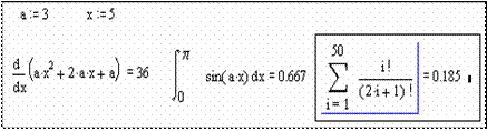 Вычисление определенных интегралов, численное дифференцирование, определение сумм, произ- ведений и пределов выполняется при помощи палитры "Вычисления" (рис. 3в). Пример ввода формул дифференцирования, интегрирования и суммирования приведен на рис. 4.