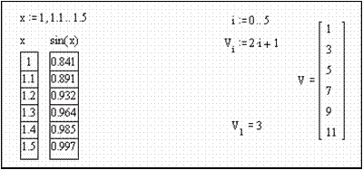 Элементы другого типа массива – вектора– могут задаваться при помощи кнопки палитры математических знаков "Арифметика" (рис.3а). Например, посредством ранжированной переменной i определим индексы (от 0 до 5) вектора V, значения которого находятся по формуле Vi=2i+1 (рис. 5, б).