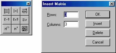 Самая первая кнопка данной палитры позволяет задать шаблон матрицы. После ее нажатия на экране появляется окно ввода матрицы (рис. 6, б), в котором запрашивается число строк – Rows и число столбцов – Columns. После ввода данных параметров и нажатия в окне кнопки "Insert" на экране появляется шаблон вводимой матрицы с черными квадратиками на месте будущих элементов (рис. 7).