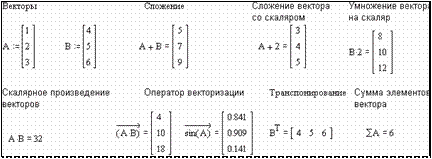 При помощи обычных арифметических знаков производятся операции сложения, вычитания, сложения вектора с константой и умножения вектора на скаляр. Знак умножения для двух векторов позволяет вычислить их скалярное произведение, т.е. A×B=A0B0+A1B1+A2B2=32. Кнопка палитры "Векторы и матрицы" (рис. 6а) выполняет транспонирование вектора-столбца B в вектор-строку, кнопка подсчитывает сумму элементов вектора. Особую роль выполняет оператор векторизации (кнопка ).Он позволяет применять многие скалярные функции к вектору или матрице. Например (рис. 8), операция умножения двух векторов под знаком векторизации производится поэлементно, а результатом выполнения функции sin(A) будет вектор, элементы которого есть значения синуса от соответствующих элементов вектора A.
