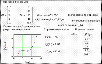 Например, на рис. 22 исходная табличная зависимость y(x) задается векторами VX и VY (по 5 точек). Затем определяется, так называемая, интерполяционная функция f_i(x), которая позволяет для любого значения аргумента x определить искомую величину функции y. График этой функции представлен на рис. 22 (пунктир) вместе с узловыми точками (крестики). Из рис. 22 видно, что в узловых точках VXi зна- чения функции f_i(x) совпадают с табличными VY.