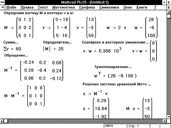 Некоторые из операторов Mathcad имеют особые значения в применении к векторам и матрицам. Например, символ умножения означает просто умножение, когда применяется к двум числам, но он же означает скалярное произведение, когда применяется к векторам, и умножение матриц — когда применяется к матрицам.