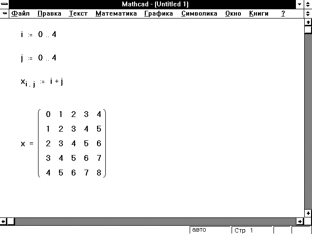 Если в формуле используется два дискретных аргумента, Mathcad пробегает через каждое значение каждого дискретного аргумента. Это можно использовать для определения матриц. Например, чтобы определить матрицу x размера 5x5, где xi,j = i + j, напечатайте формулы:
