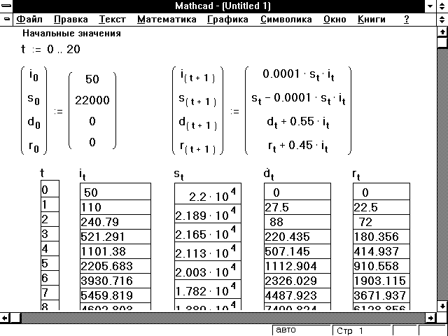 При выполнении многократных вычислений нескольких переменных на каждом шаге вычисляются значения переменных на основе всех их предыдущих значений. Нельзя сделать это с отдельными уравнениями, потому что, когда Mathcad видит формулу с дискретным аргументом, он пытается вычислить её для каждого значения дискретного аргумента перед переходом к следующему уравнению. Значит, следует создать одну формулу, которая выполняет вычисления со всеми переменными одновременно.