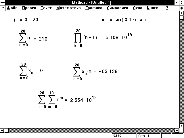 На Рисунке 2 приведены примеры использования обобщенных операторов суммы и произведения. Эти операторы, в отличие от операторов, созданных с помощью [Ctrl][Shift]4и[Ctrl][Shift]3, не могут быть автономными. Они требуют, чтобы ранее был определен дискретный аргумент. Однако один дискретный аргумент может использоваться с любым числом этих операторов.
