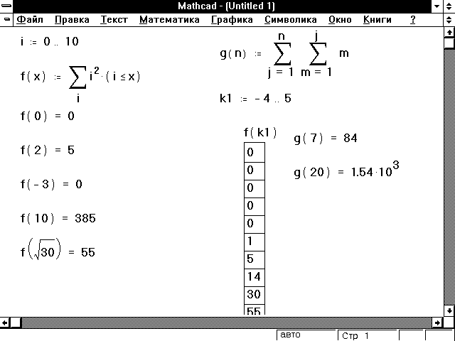 Когда используется оператор суммирования, показанный на Рисунке 1, индекс суммирования должен быть целым и изменяться с шагом 1. Mathcad использует обобщение этих операторов, которые могут использовать любой дискретный аргумент как индекс суммирования. Чтобы использовать эти операторы, сначала определите дискретный аргумент. В следующем примере напечатайте i:1 , 2;10.Затем: