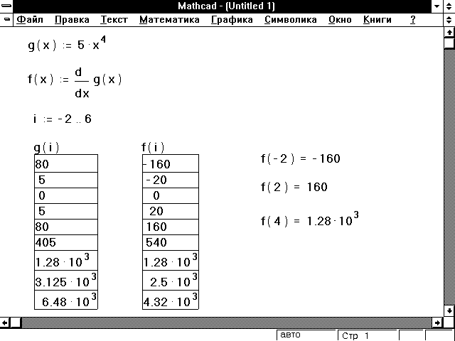 Необходимо помнить, что результат дифференцирования есть не функция, а число — значение производной в указанной точке переменной дифференцирования. В предыдущем примере производная от x3 не есть выражение 3x2, а значение 3x2, вычисленное в точке x = 2. Информацию по поводу символьного вычисления производных см. в Главе “Символьные вычисления”.