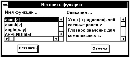 Левый список диалогового окна “Вставить функцию” показывает все встроенные функции наряду с их аргументами. В окошке справа появляется описание выбранной функции. Чтобы применить функцию к уже введённому выражению, заключите выражение в синюю выделяющую рамку и вызовите функцию, как это описано выше.