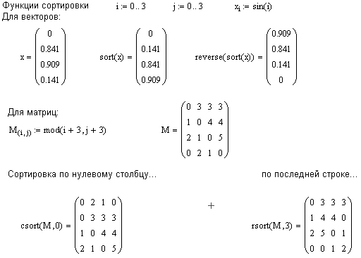 Mathcad содержит три функции, показанные на Рисунке 4, для сортировки массивов и одну для обращения порядка их элементов: