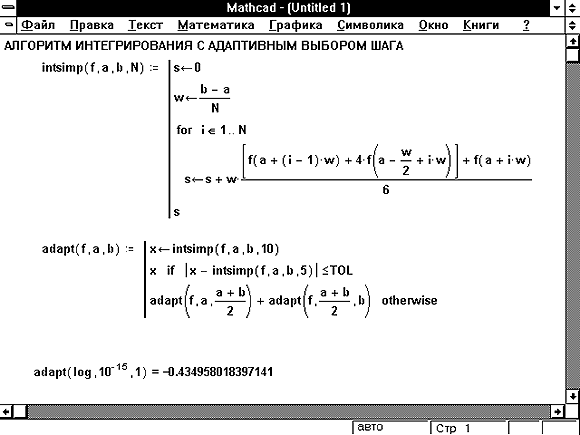 Одним из путей, которым многие программисты избегают нагромождения сложных программных конструкций, является перенесение сложностей в “подпрограммы.” На Рисунке 9 показано, как это можно сделать в Mathcad. Определив intsimp где-нибудь в другом месте и использовав его внутри adapt, можно сделать программу, определяющую adapt, значительно проще. Определение adapt стало бы значительно более громоздким, если бы оба вхождения intsimp в него нужно было бы заменять длиннющим определением intsimp, приведенным в верхней части рисунка.