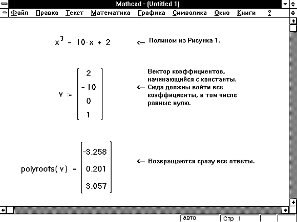лучше использовать функцию polyroots, нежели root. В отличие от функции root, функция polyroots не требует начального приближения. Кроме того, функция polyroots возвращает сразу все корни, как вещественные, так и комплексные. На Рисунках 3 и 4 приведены примеры использования функции polyroots.