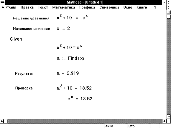 На Рисунке 5 показан рабочий документ, который использует блок решения уравнений для решения одного уравнения с одним неизвестным. Так как имеется только одно уравнение, то только одно уравнение появляется между ключевым словом Given и формулой, включающей функцию Find. Так как уравнение имеет одно неизвестное, то функция Find имеет только один аргумент. Для решения одного уравнения с одним неизвестным можно также использовать функцию root, как показано ниже: