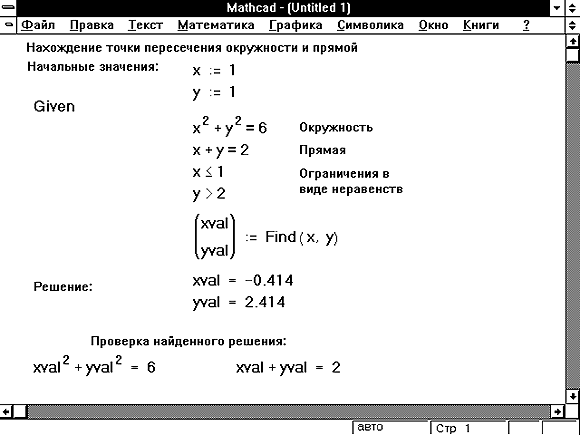 Mathcad дает возможность решать также и системы уравнений. Максимальное число уравнений и переменных равно пятидесяти. В первой части этого раздела описаны процедуры решения систем уравнений. В заключительной части приведены примеры и проведено обсуждение некоторых часто встречающихся ошибок. Результатом решения системы будет численное значение искомого корня. Для символьного решения уравнений необходимо использовать блоки символьного решения уравнений. При символьном решении уравнений искомый корень выражается через другие переменные и константы.