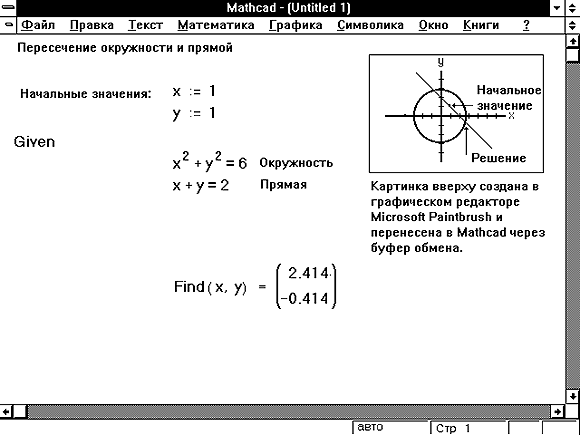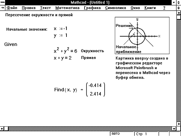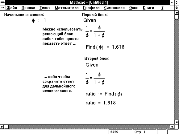 · Можно вывести найденное решение, напечатав выражение вида Find(variable) =. Пример приведен в верхней половине Рисунка 7. Если решаются уравнения с несколькими неизвестными, то можно вывести вектор результатов, введя выражение вида Find(vari1,var2,...) =. Пример того, как это делается для системы двух уравнений с двумя неизвестными, приведен на Рисунке 8.