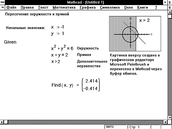 Mathcad возвращает в блоке решения уравнений только одно решение. Однако система уравнений может иметь несколько различных решений. Если одно из решений найдено, то для поиска других решений можно использовать различные начальные приближения либо дополнительные ограничения в виде неравенств, которым найденное решение не удовлетворяет. На Рисунке 9 показано, как иное начальное приближение может приводить к другому решению задачи, приведенной на Рисунке 8. На Рисунке 10 показано, как добавить ограничения в виде неравенства для поиска другого решения.